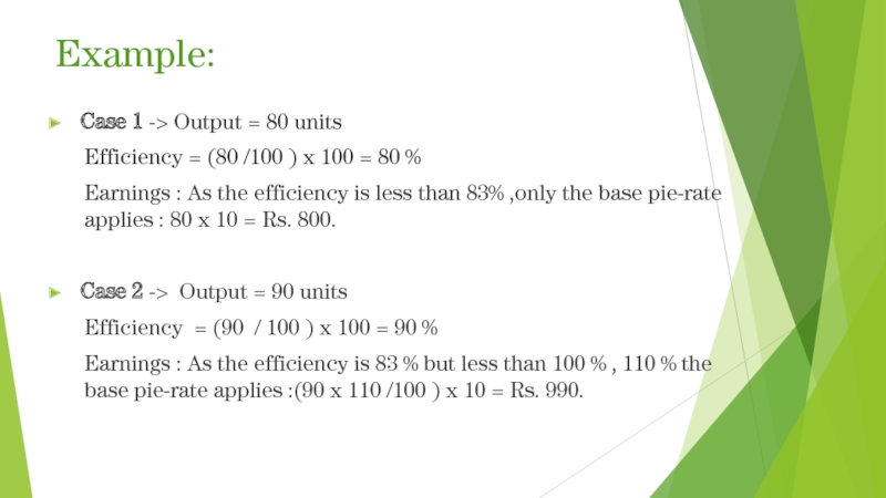 Earnings : As the efficiency is less than 83% ,only the base pie-rate applies : 80 x 10 = Rs. 800.