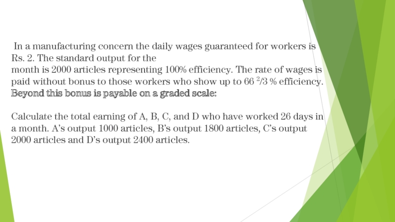 hours time. A rate of 45% is paid if the output is 200 or more units and 35%, if production is less than 200 units. Worker A has produced 240 units and B produced 180 units.