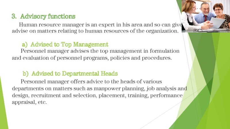 Personnel manager offers advice to the heads of various departments on matters such as manpower planning, job analysis and design, recruitment and selection, placement, training, performance appraisal, etc.