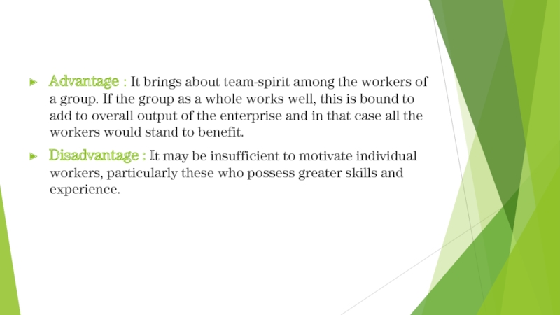 Слайд 73Advantage : It brings about team-spirit among the workers of a