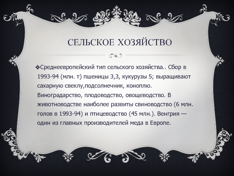 3,3, кукурузы 5; выращивают сахарную свеклу,подсолнечник, коноплю. Виноградарство, плодоводство, овощеводство. В животноводстве наиболее развиты свиноводство (6 млн. голов в 1993-94) и птицеводство (45 млн.). Венгрия — один из главных производителей меда в Европе.