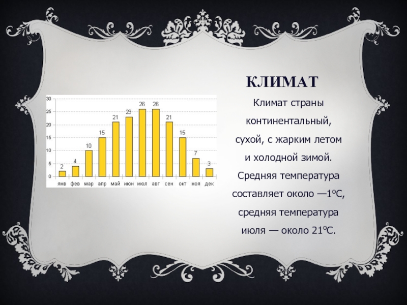 Климат страны континентальный, сухой, с жарким летом и холодной зимой. Средняя температура составляет