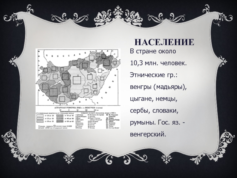 В стране около 10,3 млн. человек. Этнические гр.: венгры (мадьяры), цыгане, немцы,