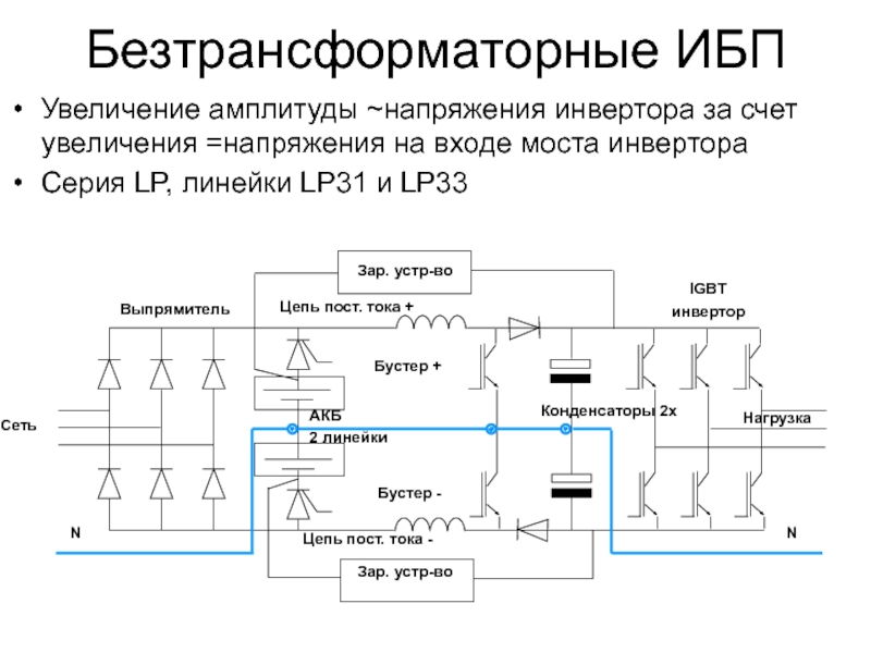 Слайд 9Увеличение амплитуды ~напряжения инвертора за счет увеличения =напряжения на входе моста