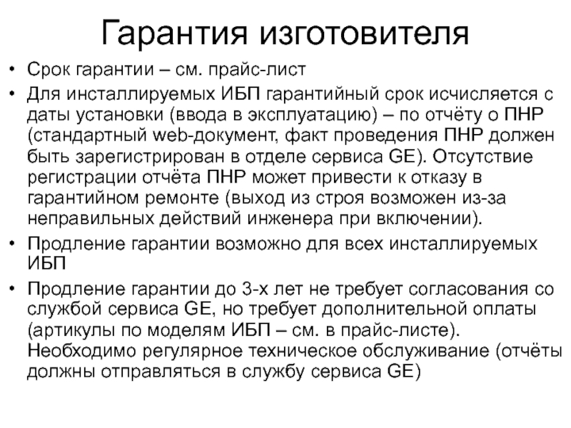 Продление гарантии до 3-х лет не требует согласования со службой сервиса GE, но требует дополнительной оплаты (артикулы по моделям ИБП – см. в прайс-листе). Необходимо регулярное техническое обслуживание (отчёты должны отправляться в службу сервиса GE)