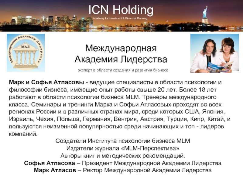 и Софья Атласовы - ведущие специалисты в области психологии и философии бизнеса, имеющие опыт работы свыше 20 лет. Более 18 лет работают в области психологии бизнеса MLM. Тренеры международного класса. Семинары и тренинги Марка и Софьи Атласовых проходят во всех регионах России и в различных странах мира, среди которых США, Япония, Израиль, Чехия, Польша, Германия, Венгрия, Австрия, Турция, Кипр, Китай, и пользуются неизменной популярностью среди начинающих и топ - лидеров компаний.