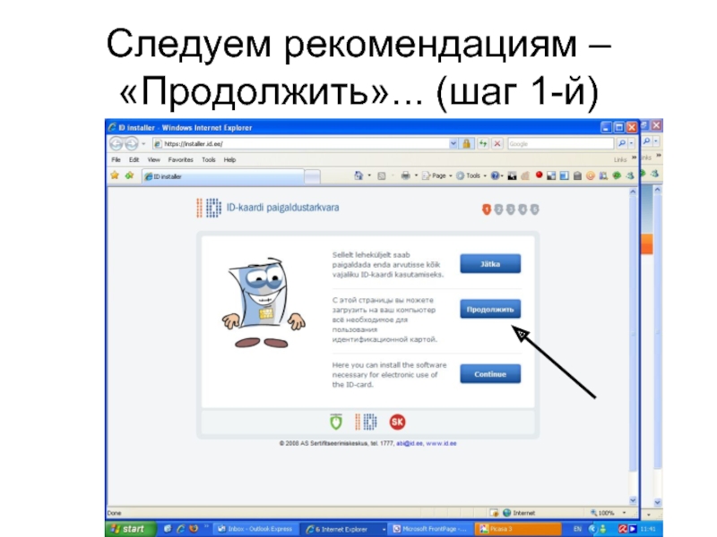 Слайд 6Следуем рекомендациям – «Продолжить»... (шаг 1-й)