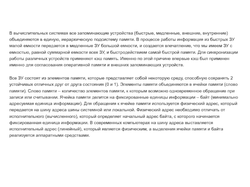 Иерархия памяти современных компьютеров строится на нескольких уровнях, причем более высокий уровень меньше по объему, быстрее и имеет большую стоимость в пересчете на байт, чем более низкий уровень.