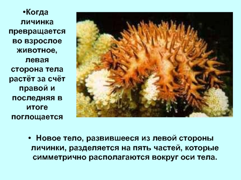 Когда личинка превращается во взрослое животное, левая сторона тела растёт за счёт правой и последняя в итоге поглощается