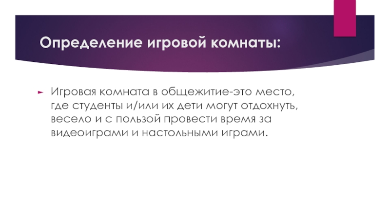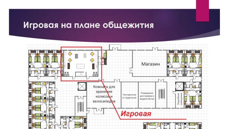 Описание игровой: В игровой будет: один кикер(настольный футбол),один настольный хоккей, один стол для пинг-понга, три стола, две видеоприставки, два симулятора гонок.Оборудование и инвентарь будет выдаваться комендантом у входа. Ответственность за инвентарь несет сам комендант.