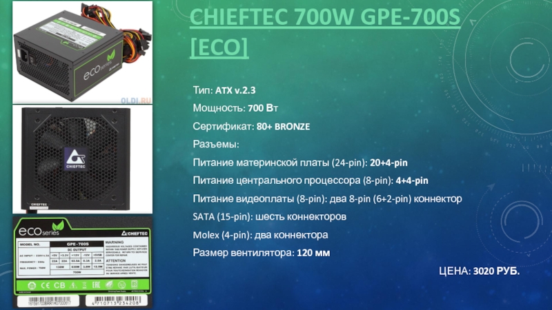 ![CHIEFTEC 700W GPE-700S [ECO]Тип: ATX v.2.3Мощность: 700 ВтСертификат: 80+ BRONZEРазъемы: Питание материнской платы (24-pin): 20+4-pinПитание центрального](/img/tmb/3/275426/2e44c7f146a0b162a8d6dea7535399a7-800x.jpg)