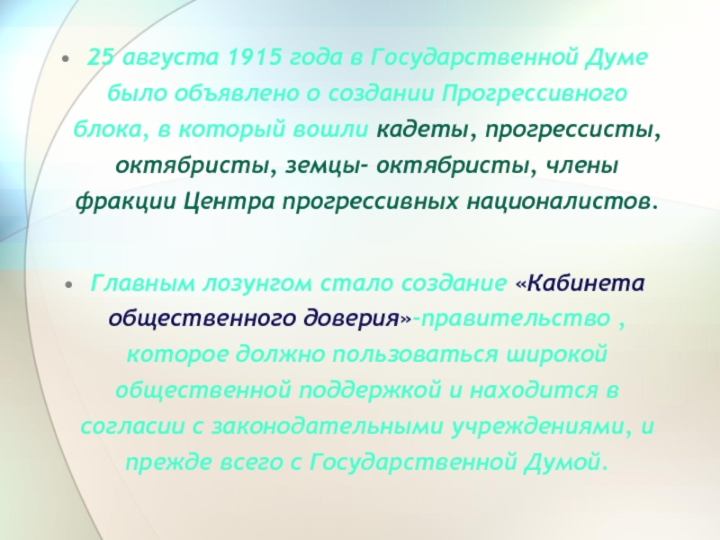 Главным лозунгом стало создание «Кабинета общественного доверия»-правительство , которое должно пользоваться широкой общественной поддержкой и находится в согласии с законодательными учреждениями, и прежде всего с Государственной Думой.