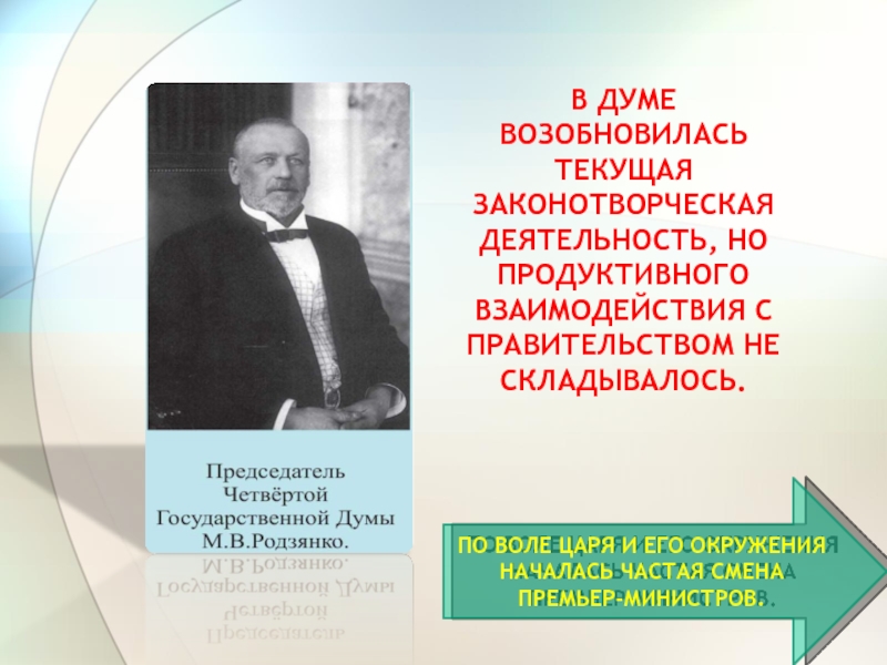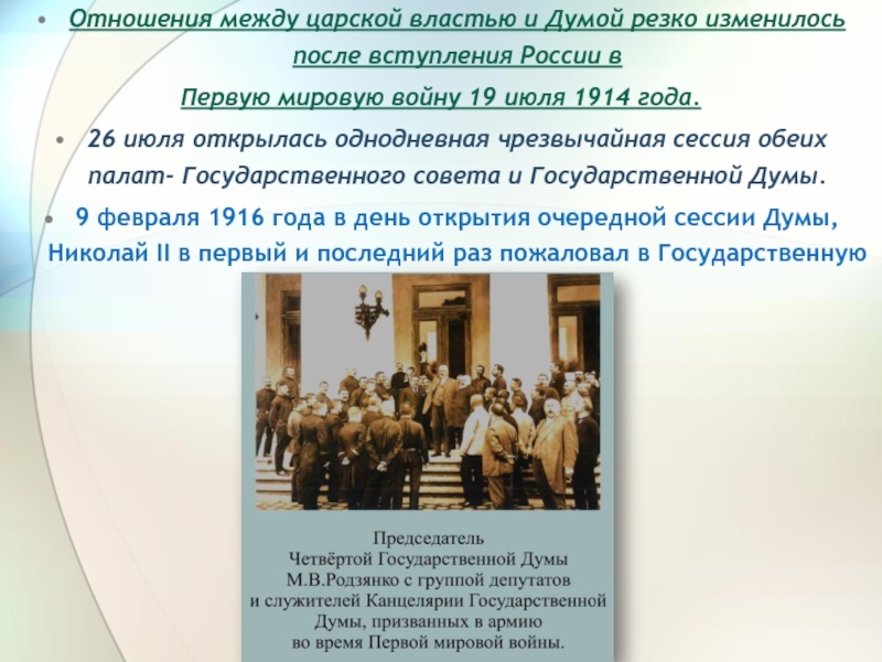 Слайд 20Отношения между царской властью и Думой резко изменилось после вступления России