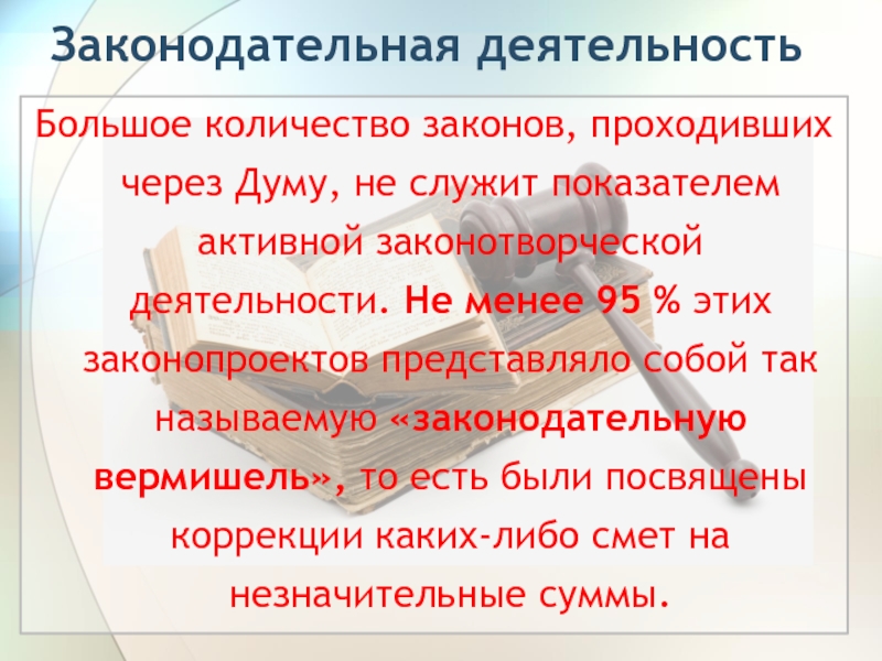 законотворческой деятельности. Не менее 95 % этих законопроектов представляло собой так называемую «законодательную вермишель», то есть были посвящены коррекции каких-либо смет на незначительные суммы.