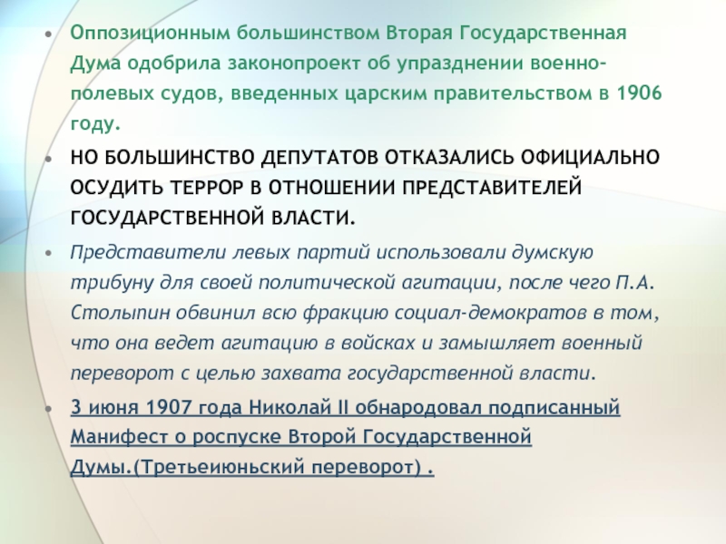 Слайд 7Оппозиционным большинством Вторая Государственная Дума одобрила законопроект об упразднении военно-полевых судов,