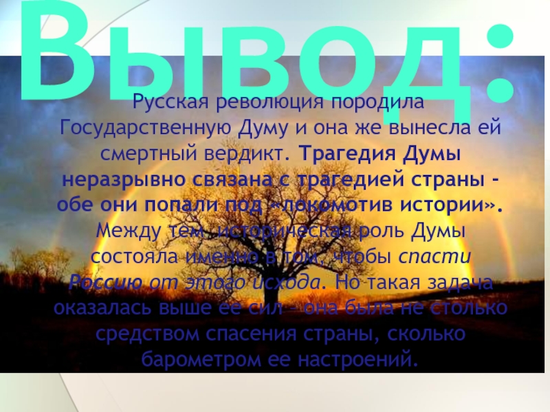 вердикт. Трагедия Думы неразрывно связана с трагедией страны - обе они попали под «локомотив истории». Между тем историческая роль Думы состояла именно в том, чтобы спасти Россию от этого исхода. Но такая задача оказалась выше ее сил – она была не столько средством спасения страны, сколько барометром ее настроений.