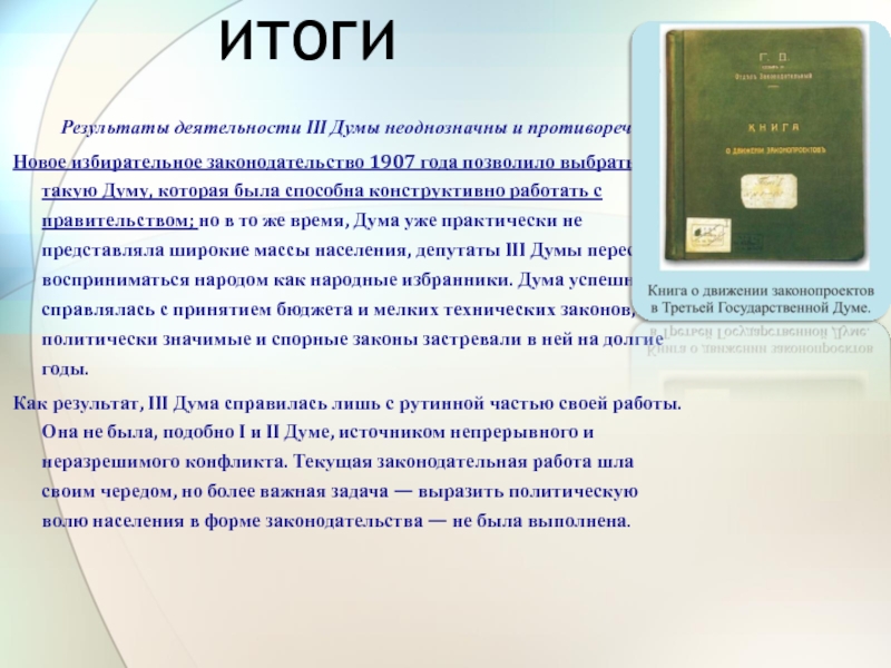года позволило выбрать такую Думу, которая была способна конструктивно работать с правительством; но в то же время, Дума уже практически не представляла широкие массы населения, депутаты III Думы перестали восприниматься народом как народные избранники. Дума успешно справлялась с принятием бюджета и мелких технических законов, но политически значимые и спорные законы застревали в ней на долгие годы.
