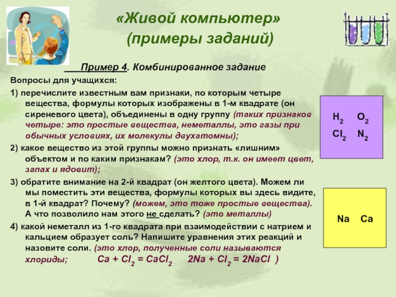 1) перечислите известным вам признаки, по которым четыре вещества, формулы которых изображены в 1-м квадрате (он сиреневого цвета), объединены в одну группу (таких признаков четыре: это простые вещества, неметаллы, это газы при обычных условиях, их молекулы двухатомны);