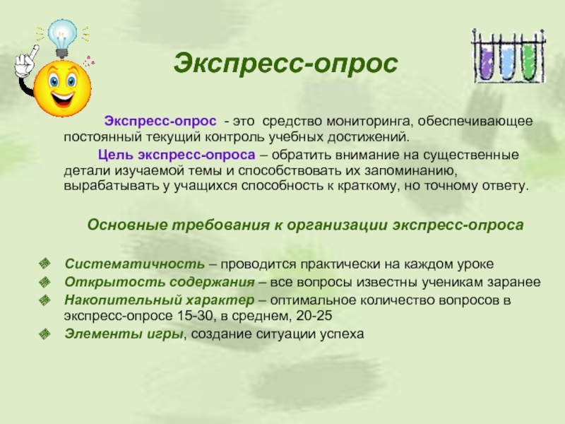Цель экспресс-опроса – обратить внимание на существенные детали изучаемой темы и способствовать их запоминанию, вырабатывать у учащихся способность к краткому, но точному ответу.