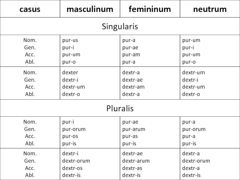 прилагательного мужского рода даются окончания женского и среднего рода в именительном падеже единственного числа. Например: purus, a, um – чистый, -ая, -ое; ruber, bra, brum – красный, -ая, -ое.