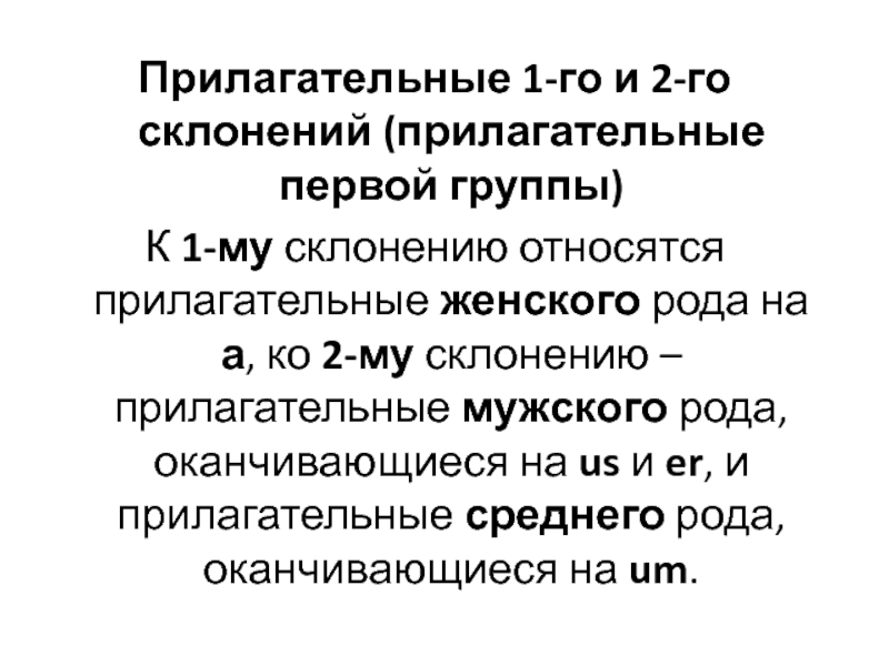 прилагательные женского рода на а, ко 2-му склонению – прилагательные мужского рода, оканчивающиеся на us и er, и прилагательные среднего рода, оканчивающиеся на um.