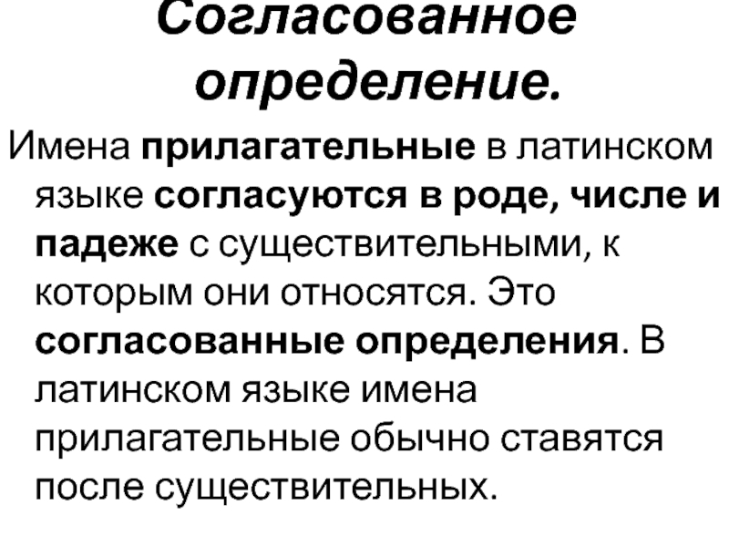 падеже с существительными, к которым они относятся. Это согласованные определения. В латинском языке имена прилагательные обычно ставятся после существительных.