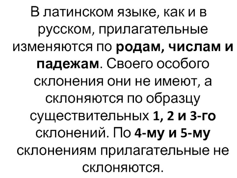 числам и падежам. Своего особого склонения они не имеют, а склоняются по образцу существительных 1, 2 и 3-го склонений. По 4-му и 5-му склонениям прилагательные не склоняются.