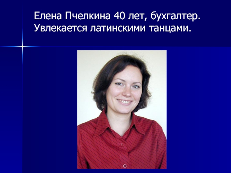 Слайд 5Елена Пчелкина 40 лет, бухгалтер. Увлекается латинскими танцами.