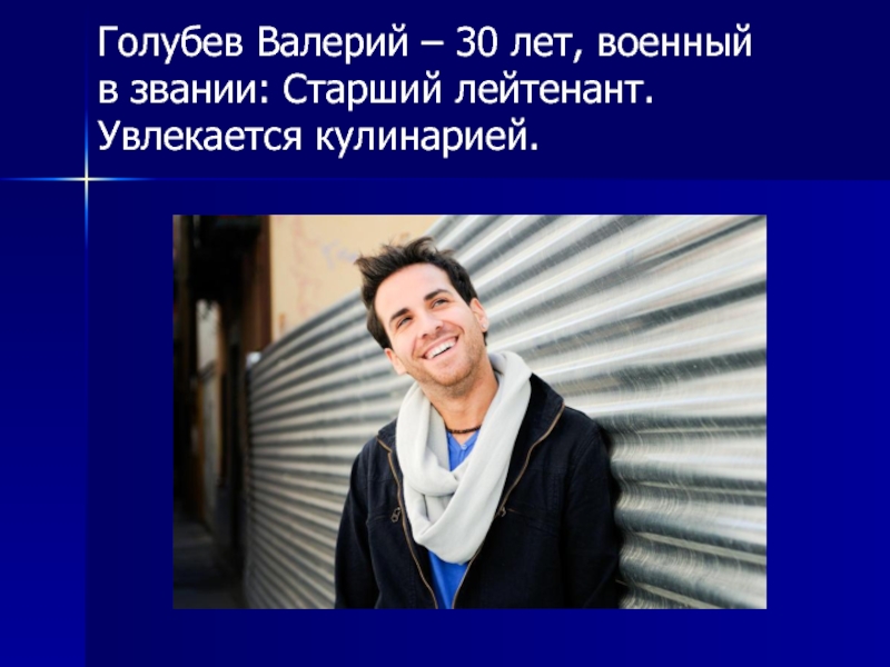Слайд 4Голубев Валерий – 30 лет, военный в звании: Старший лейтенант. Увлекается