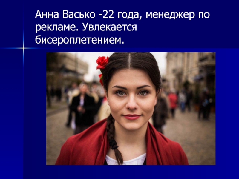 Слайд 3Анна Васько -22 года, менеджер по рекламе. Увлекается бисероплетением.
