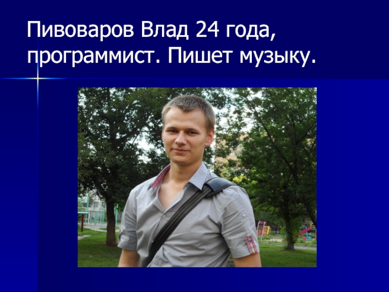 Слайд 11Пивоваров Влад 24 года, программист. Пишет музыку.