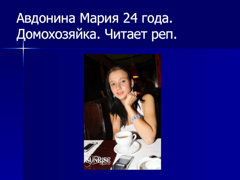 Слайд 10Авдонина Мария 24 года. Домохозяйка. Читает реп.