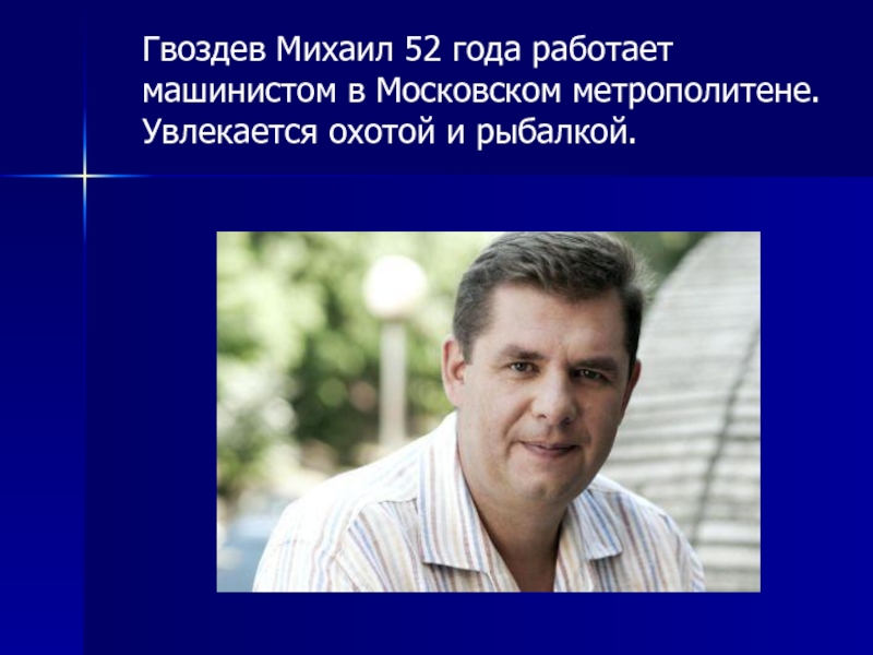Слайд 2Гвоздев Михаил 52 года работает машинистом в Московском метрополитене. Увлекается охотой
