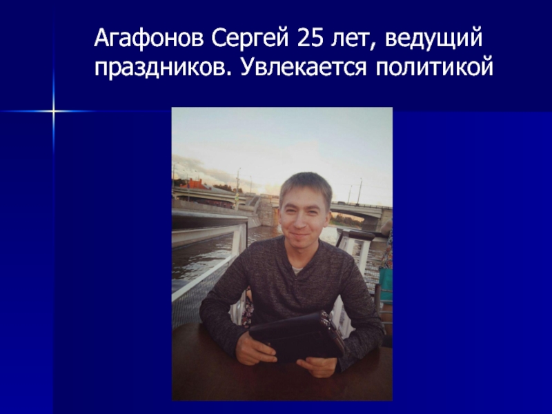 Слайд 9Агафонов Сергей 25 лет, ведущий праздников. Увлекается политикой
