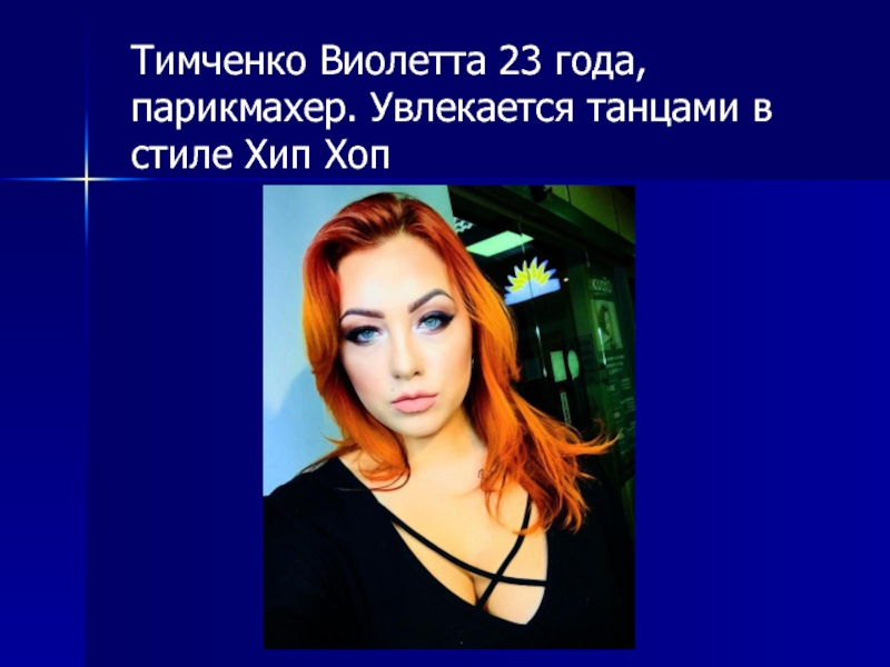 Слайд 7Тимченко Виолетта 23 года, парикмахер. Увлекается танцами в стиле Хип Хоп