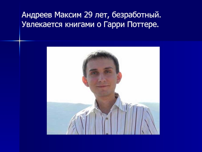 Слайд 8Андреев Максим 29 лет, безработный. Увлекается книгами о Гарри Поттере.