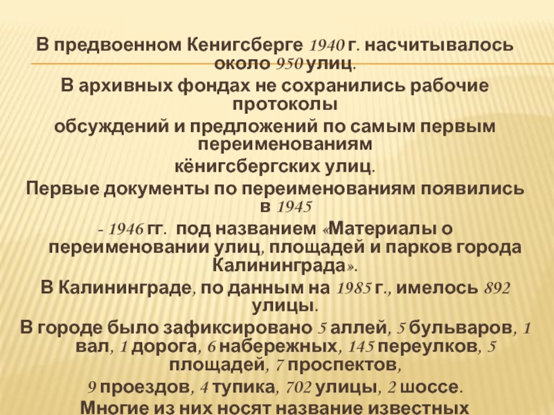 - 1946 гг. под названием «Материалы о переименовании улиц, площадей и парков города Калининграда».