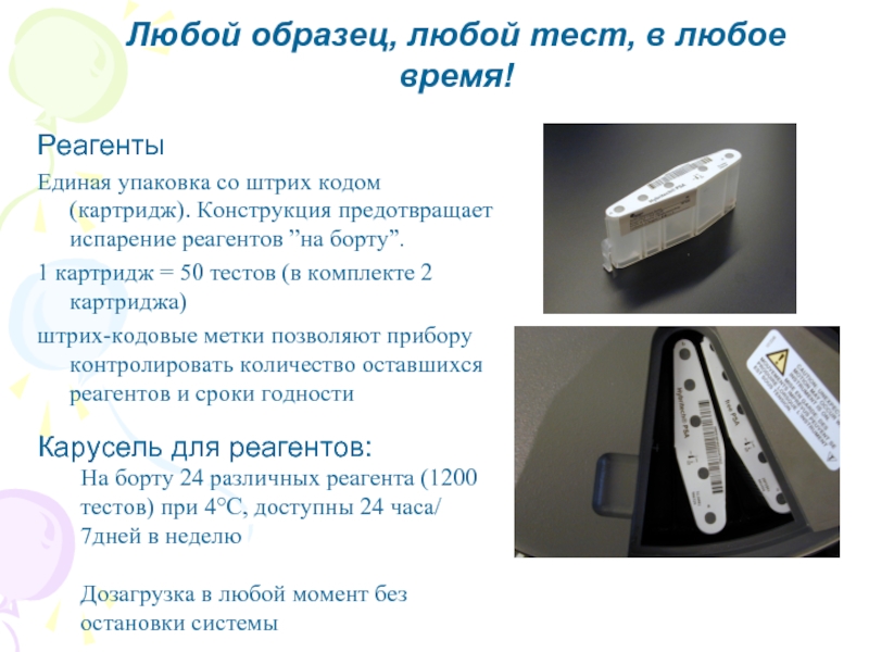 штрих-кодовые метки позволяют прибору контролировать количество оставшихся реагентов и сроки годности