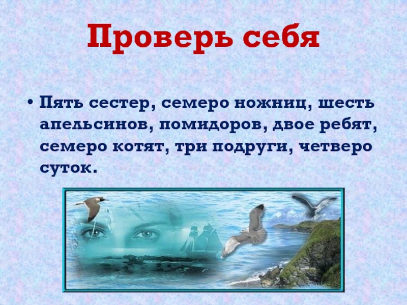 (пять, пятеро) сестры, (семь, семеро) ножниц, апельсины, помидоры,