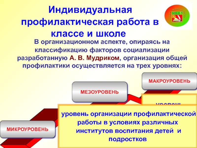В организационном аспекте, опираясь на классификацию факторов социализации разработанную А. В. Мудриком, организация общей профилактики осуществляется на трех уровнях: