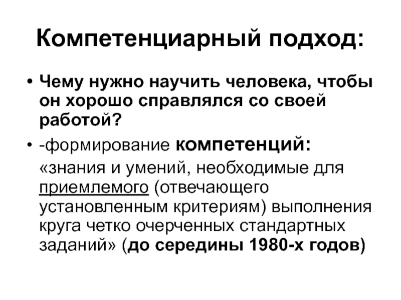 «знания и умений, необходимые для приемлемого (отвечающего установленным критериям) выполнения круга четко очерченных стандартных заданий» (до середины 1980-х годов)