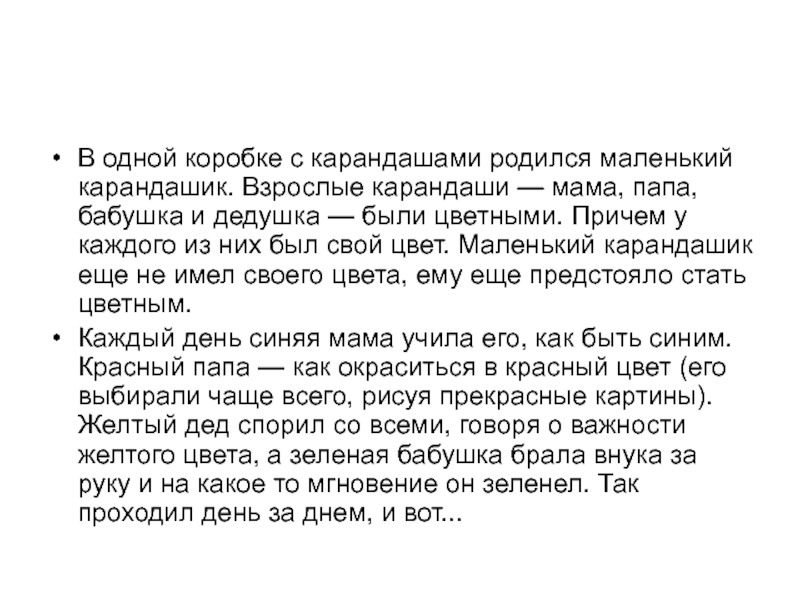 мама, папа, бабушка и дедушка — были цветными. Причем у каждого из них был свой цвет. Маленький карандашик еще не имел своего цвета, ему еще предстояло стать цветным.
