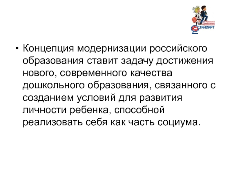 Слайд 3Концепция модернизации российского образования ставит задачу достижения нового, современного качества дошкольного