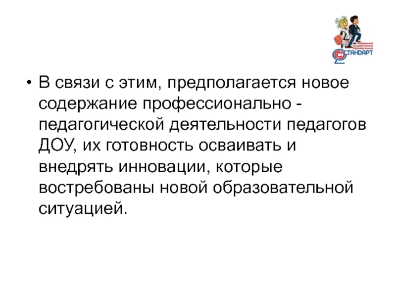 Слайд 4В связи с этим, предполагается новое содержание профессионально - педагогической деятельности