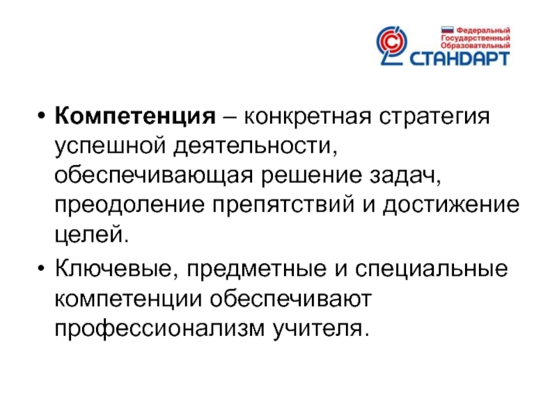 Слайд 14Компетенция – конкретная стратегия успешной деятельности, обеспечивающая решение задач, преодоление препятствий