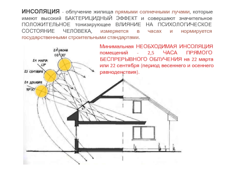 Минимальная НЕОБХОДИМАЯ ИНСОЛЯЦИЯ помещений - 2,5 ЧАСА ПРЯМОГО БЕСПРЕРЫВНОГО ОБЛУЧЕНИЯ на 22 марта или 22 сентября (период весеннего и осеннего равноденствия).