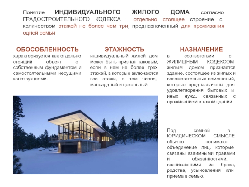 Понятие ИНДИВИДУАЛЬНОГО ЖИЛОГО ДОМА согласно ГРАДОСТРОИТЕЛЬНОГО КОДЕКСА - отдельно стоящее строение с количеством этажей не более чем три, предназначенный для проживания одной семьи