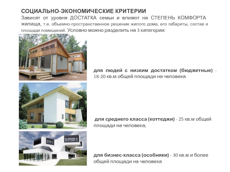 Зависят от уровня ДОСТАТКА семьи и влияют на СТЕПЕНЬ КОМФОРТА жилища, т.е. объемно-пространственное решение жилого дома, его габариты, состав и площади помещений. Условно можно разделить на 3 категории: