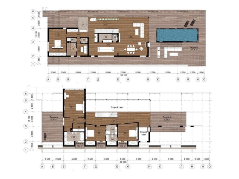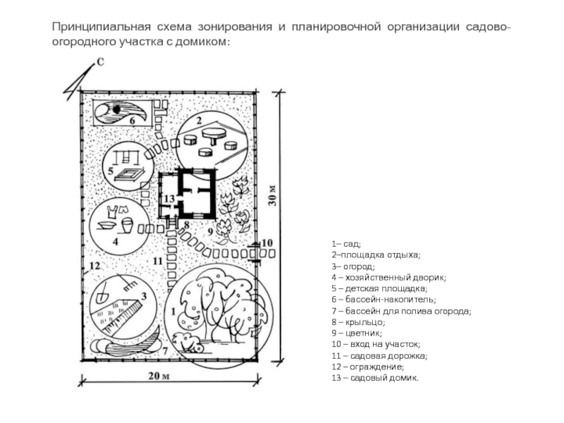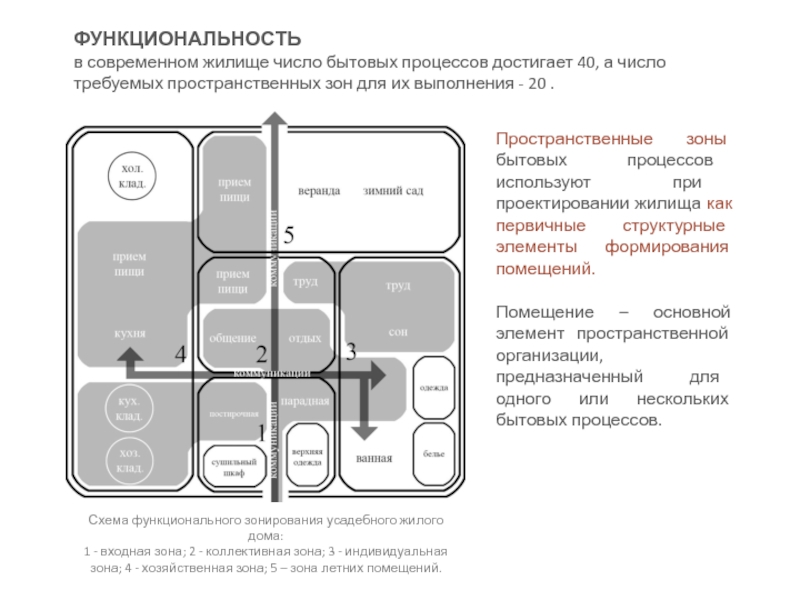 1 - входная зона; 2 - коллективная зона; 3 - индивидуальная зона; 4 - хозяйственная зона; 5 – зона летних помещений.