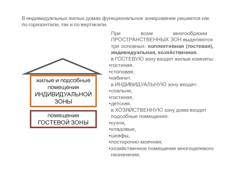 При всем многообразии ПРОСТРАНСТВЕННЫХ ЗОН выделяются три основных: коллективная (гостевая), индивидуальная, хозяйственная.